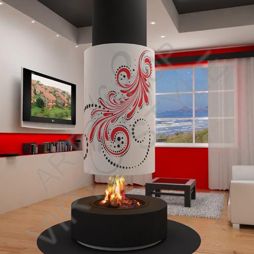 Круглый, центральный, подвесной камин. Верхняя облицовка декорирована аэрографией с перфорацией, под гжель. Предтопочный лист в комплектацию не входит. Можно доукомплектовать круглой раздвижной топкой.