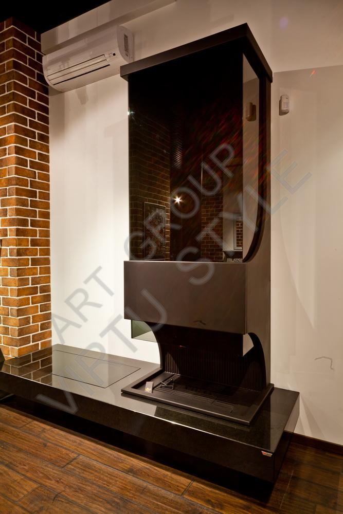 В стоимость камина входит встроенная топка, облицовка с верхним декоративным стеклом. Мраморная удлиненная столешница. Модель представлена в салоне.