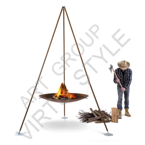 Это кострище К 47-5, только на подвесе. Модель изготовлена специально для привлечения внимания ваших гостей. Высокие ножки высотой 2.5 метра с подвешенным кострищем явно займут совсем нескромное место на вашем участке. В стандарте - сталь черного цвета, под заказ - состаренная сталь.