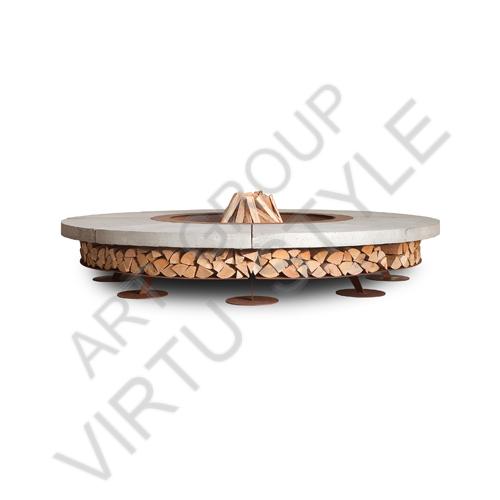 Кострище с местом для дров. Диаметр 1.5 метра,внутренний очаг 900мм. В стандарте столешница из стали черного цвета. Под заказ изготавливается из состаренной стали.