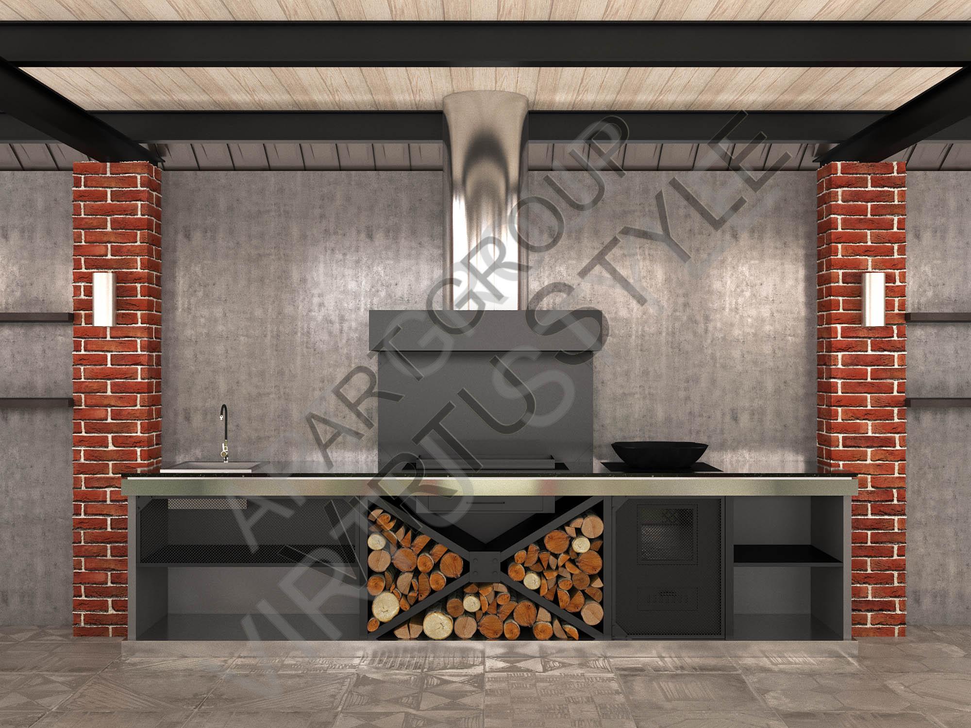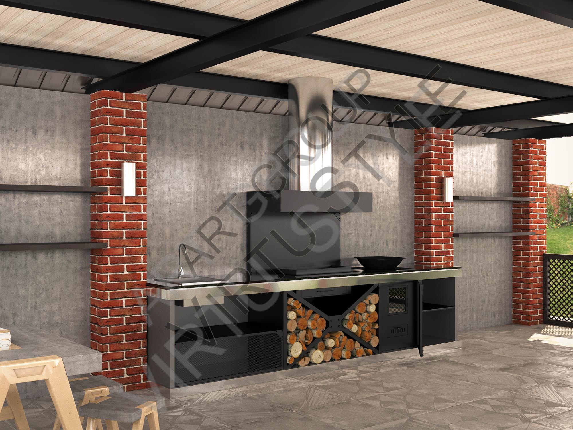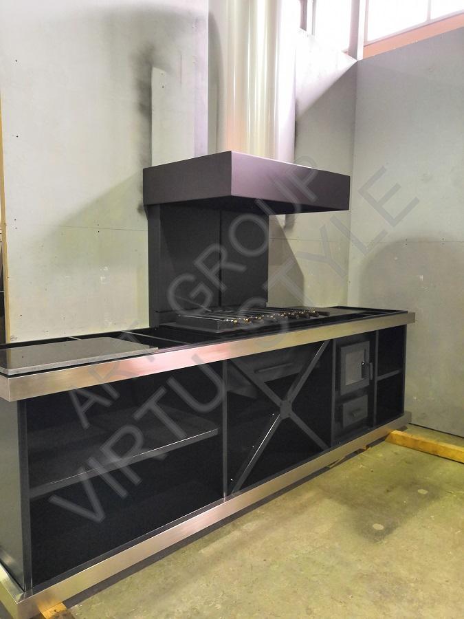 VIRTU Grand Loft - пристенный модульный комплекс шириной 3 метра, глубиной 700мм. Особенность модели Loft - открытый кухонный модуль, без дверок. В Базовую комплектацию входит - стальной каркас, декоративный нержавеющий контур, встроенный мангал, короткий дымосборник 1 метр, фартук с открывающимися стенками, мойка, печь/казан Std, встроенные полки, высота комплекса до 2.6 м.