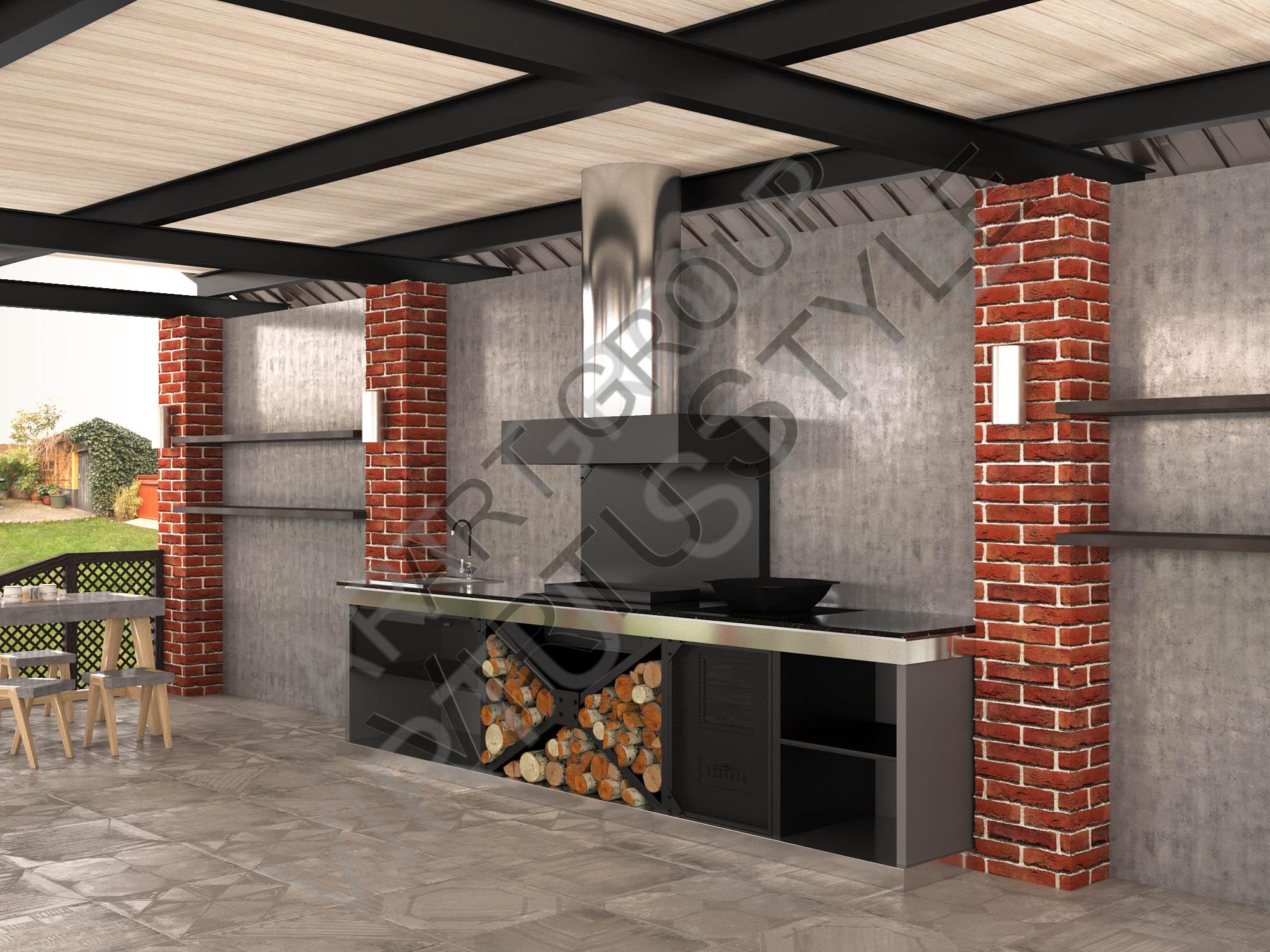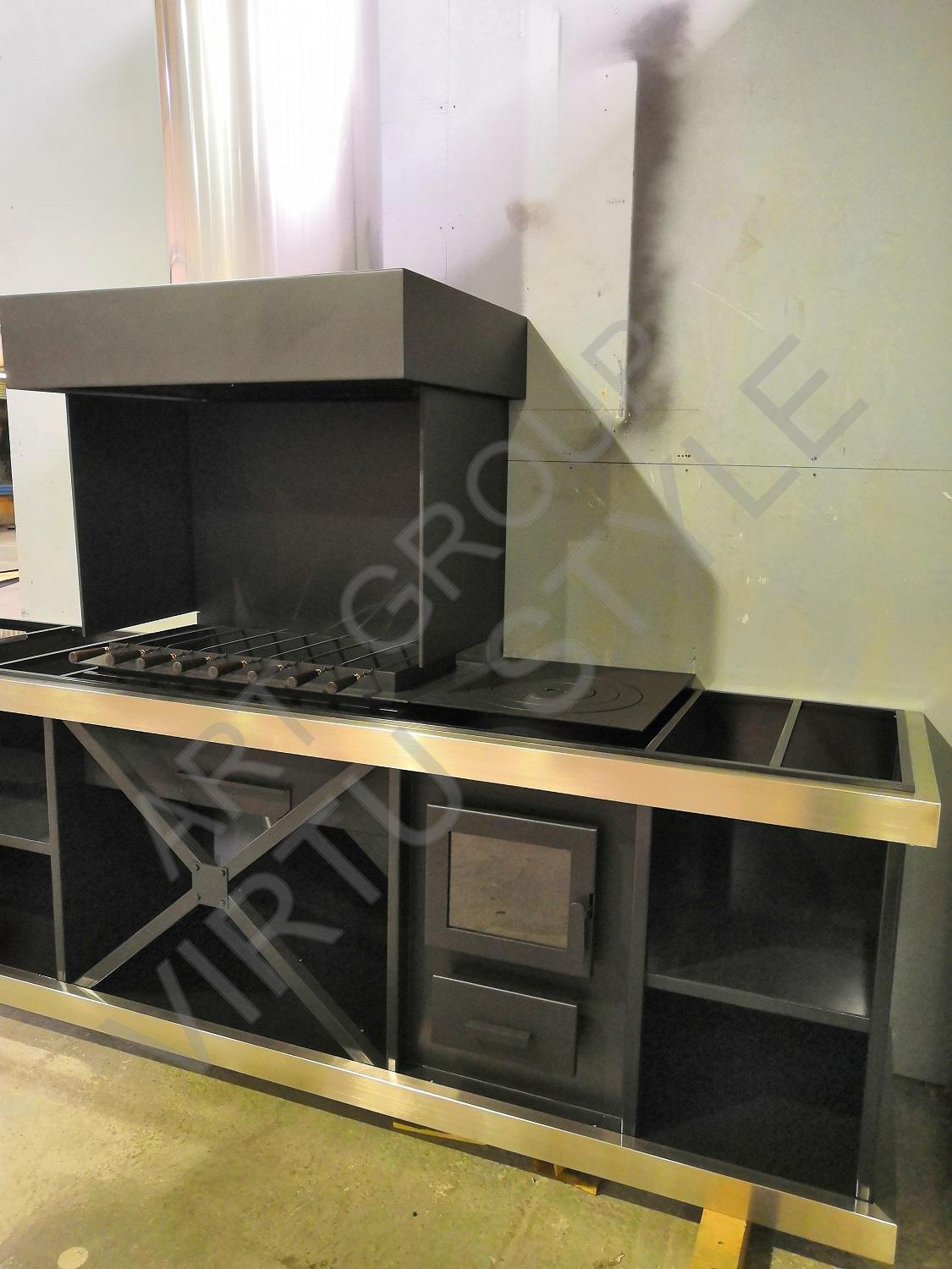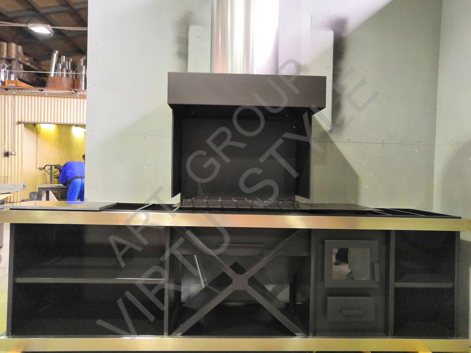 VIRTU Grand Loft - пристенный модульный комплекс шириной 3 метра, глубиной 700мм. Особенность модели Loft - открытый кухонный модуль, без дверок. В Базовую комплектацию входит - стальной каркас, декоративный нержавеющий контур, встроенный мангал, короткий дымосборник 1 метр, фартук с открывающимися стенками, мойка, печь/казан Std, встроенные полки, высота комплекса до 2.6 м.