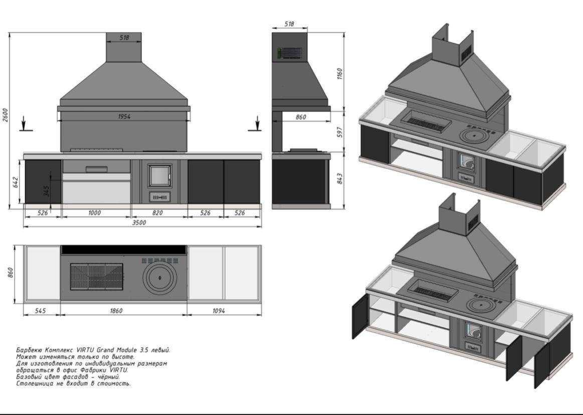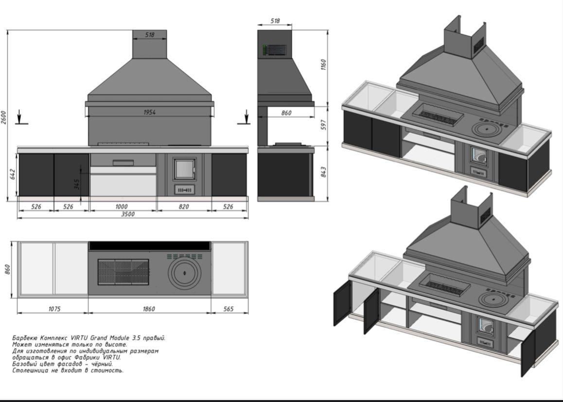 VIRTU Grand Module 3.5 - пристенный модульный комплекс шириной 3.5 метра, как Левый так и Правый. В Базовую комплектацию входит - нержавеющий каркас, всепогодний корпус, 2 декоративных нержавеющих контура , встроенный мангал, печь/казан Std, дымосборник 1,8 метра, фартук, 3 распашных фасада, место для раковины, рама для столешницы, встроенные полки, высота комплекса 2.6 м. Раковина, столешница, сборка, дымоход и доставка с разгрузкой в стоимость не входит.