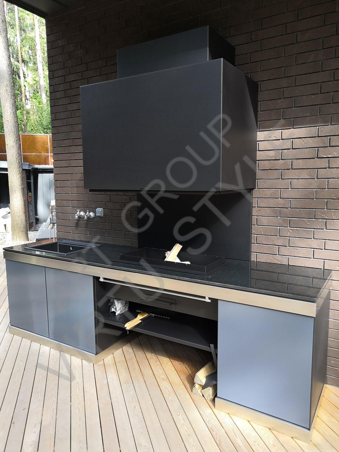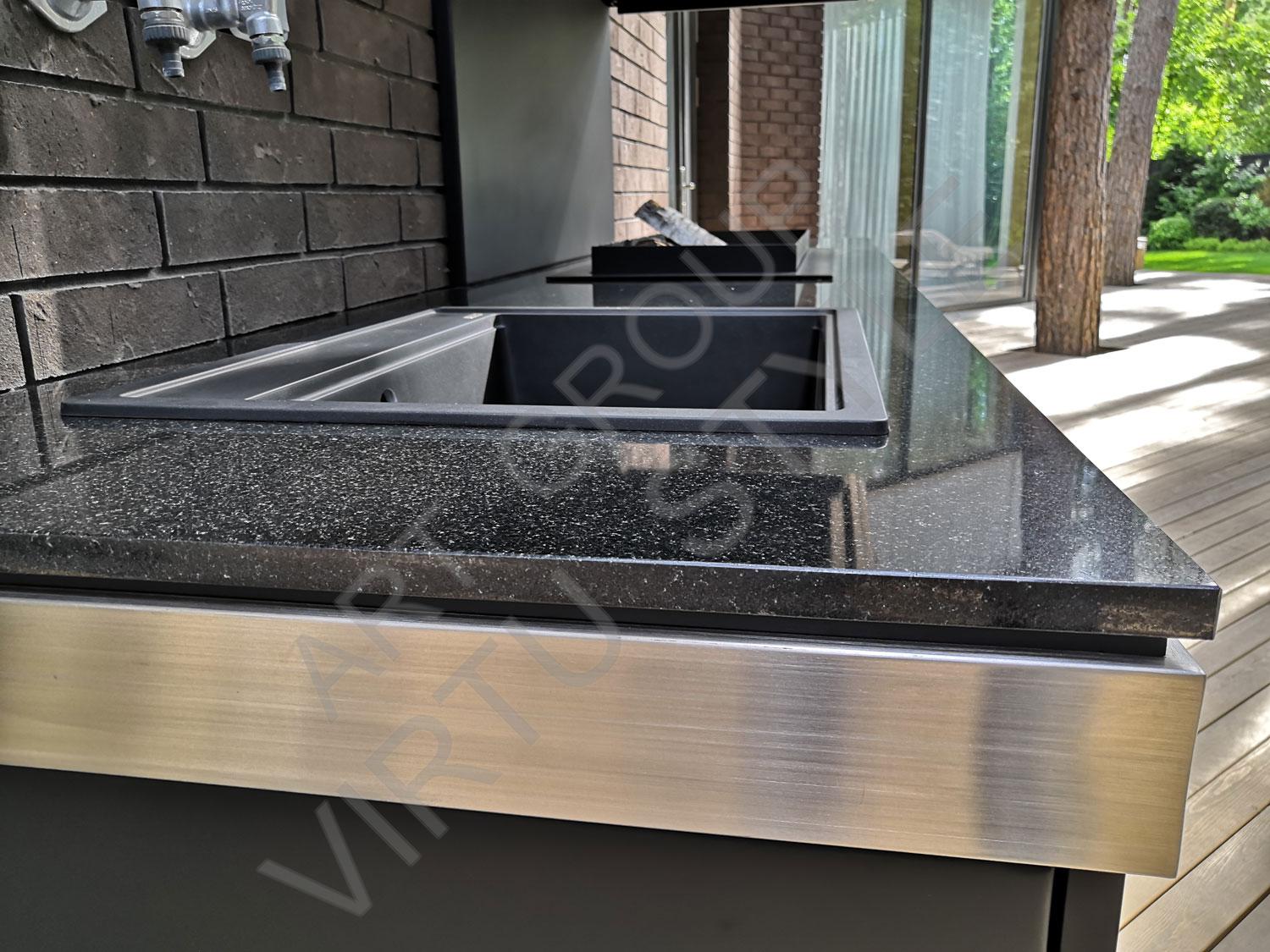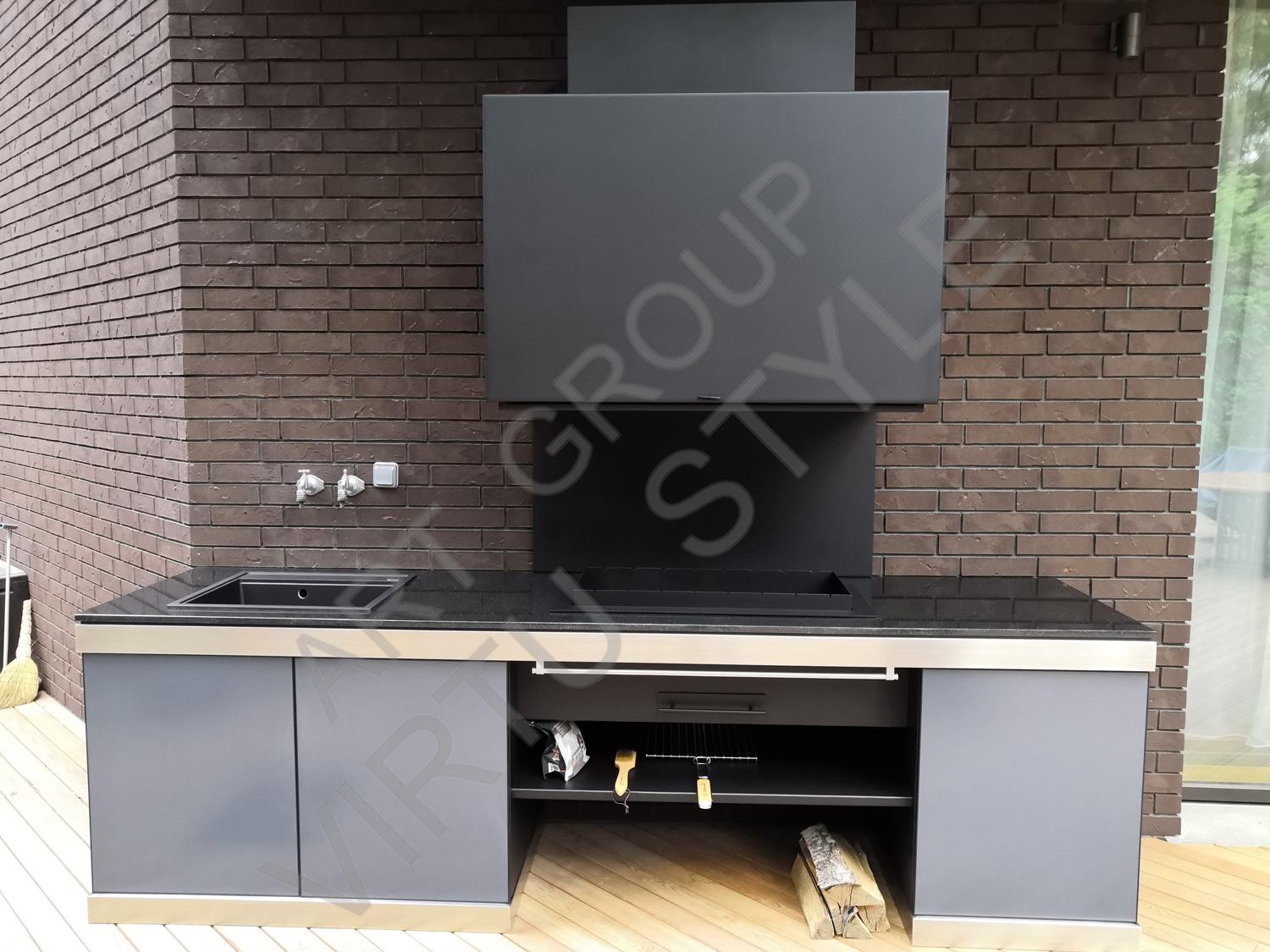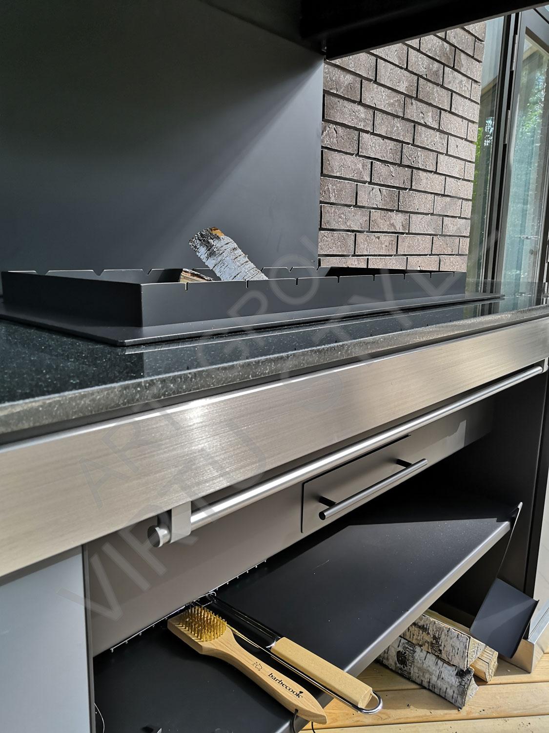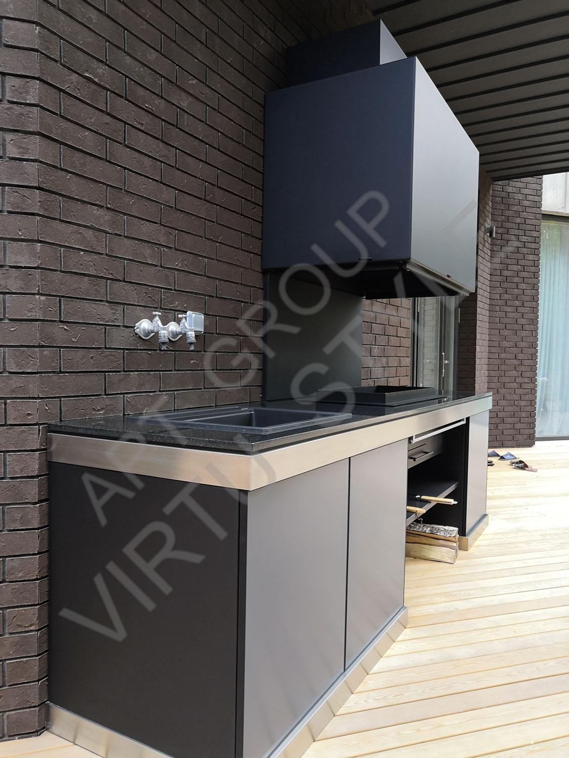 VIRTU Grand Module - пристенный модульный комплекс шириной 2.5 метра. В комплектацию этой модели входит - нержавеющий каркас, всепогодный корпус, декоративный нержавеющий контур, встроенный мангал, распашные двери, дымосборник 1 метр с декоративным кожухом, высота комплекса до 2.6 м, место под мойку, стационарные полки.