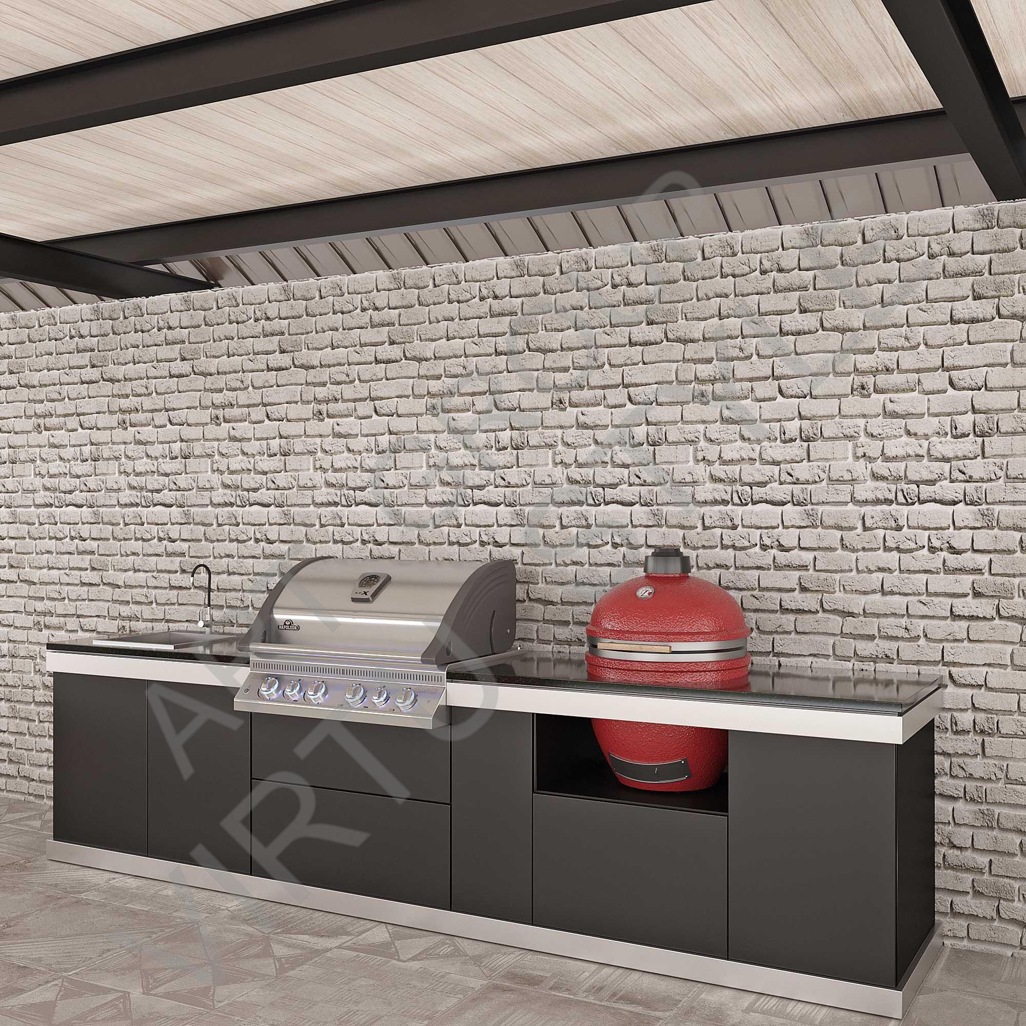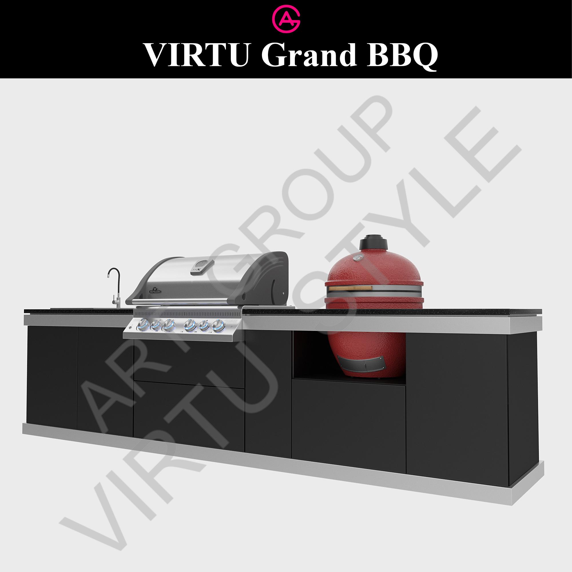 VIRTU Grand BBQ M - пристенный модульный комплекс шириной 3,5 метра. Особенность модели - адаптация газового гриля Napoleon 605 и угольного гриля Monolith Classik Pro, в стоимость оборудование не входит. В Базовую комплектацию входит - каркас из нержавеющей стали, корпус из всепогоднего материала, нержавеющий декоративный контур, раковина со смесителем, встроенные полки, распашные дверки черного цвета, высота комплекса до 2.6 м.