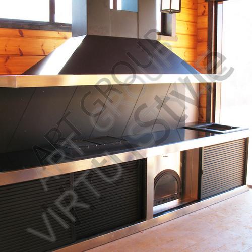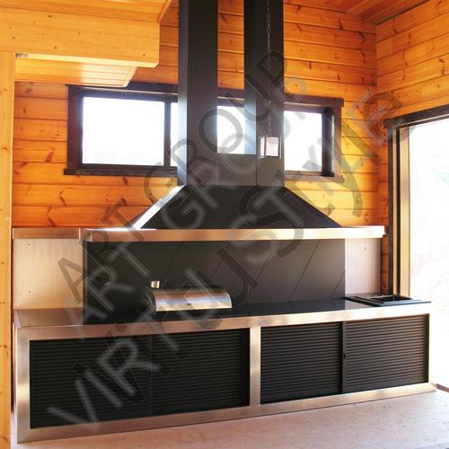 Барбекю-Комплекс Grand Roast 1 - пристенный комплекс шириной 4 метра. Комплектация - нержавеющий каркас, всепогодный корпус, нержавеющий контур, слайдерное открывание дверей, место под раковину, место под печь-пиццу, двери - жалюзийного типа, термостойкий расширенный фартук, дымосборник расширенный с нержавеющим декоративным контуром, мангал, второй декоративный дымоход.