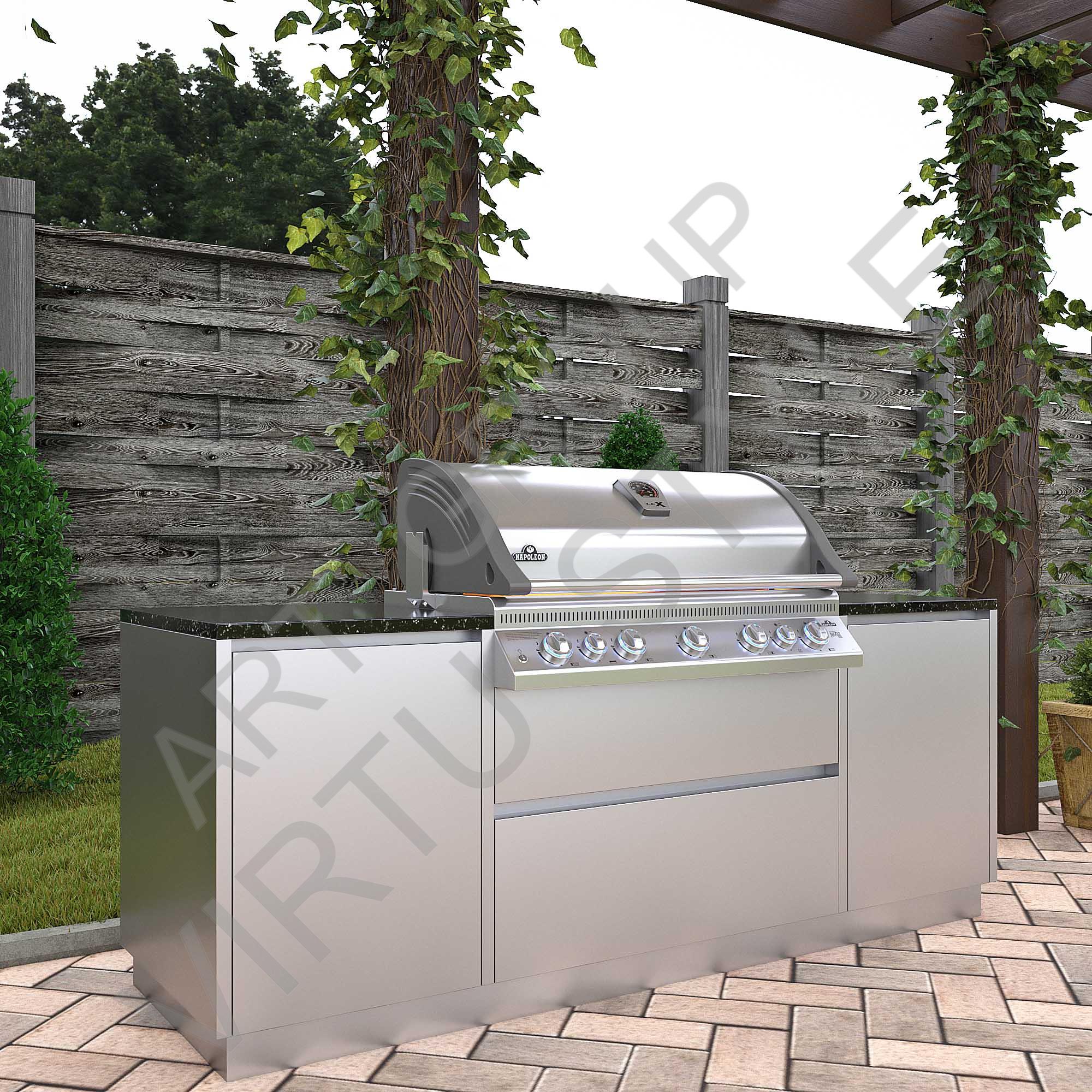 VIRTU Grand BBQ M 2.2 - пристенный модульный комплекс шириной 2.2 метра, без дымосборника, с дверками. Изготовлен из современных материалов - нержавеющая сталь, алюминий. В Базовую комплектацию входит - нержавеющий каркас, нержавеющие фасады с алюминиевой рамкой, полочки. Газовый гриль Napoleon 605 в стоимость не входит.