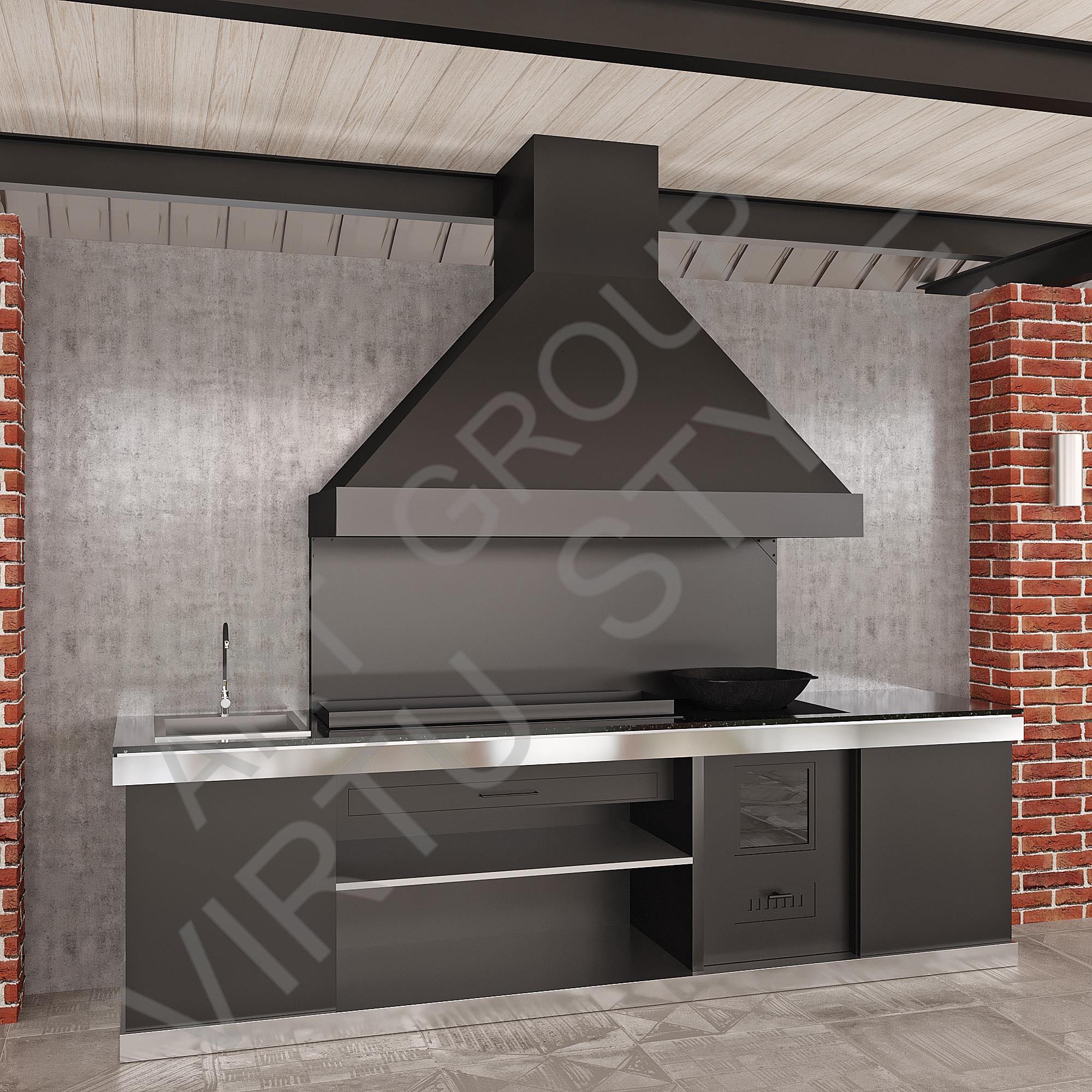 Под заказ - столешница, вариант модели дымосборника, выбор фасадов, крышка на мангал, гриль, тандыр, выдвижные ящики, подсветка дымосборника и другое дополнительное функциональное оборудование. Возможно изменение размеров Барбекю Комплекса, можно выбрать дополнительные функции, выбрать цвет и материал отделки фасадов и кожуха.