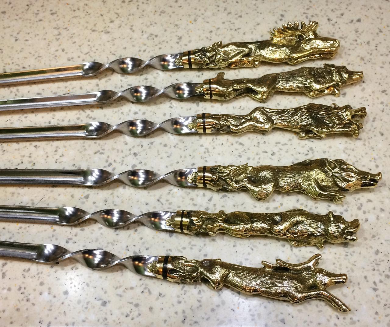 Художественное литьё из латуни, эксклюзивный дизайн, премиум-качество, нержавеющая пищевая сталь - всё это в нашем наборе шампуров "Охотник".
