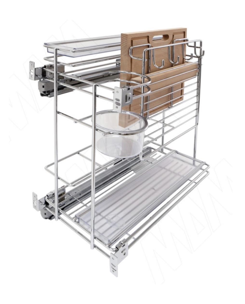 Комплектация: корзина, направляющие, крепления к фасаду, пластиковые лотки, держатель для ножей, разделочная доска, держатель бутылок