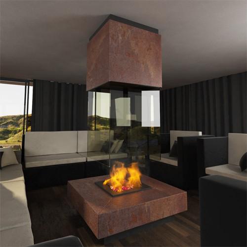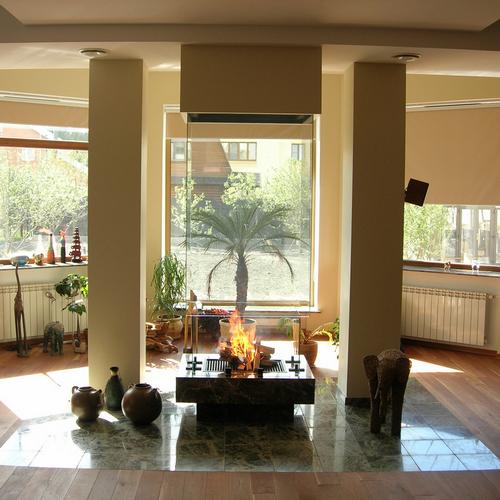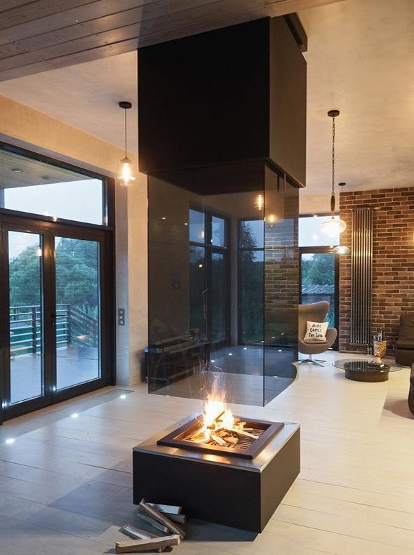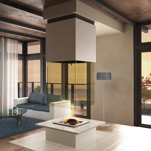 Варианты топок - открытая со всех сторон, частично открытая и закрытая с подъемным защитным экраном. Вы можете посмотреть один из реализованных проектов,где камин удачно вписан в разноуровневую комнату (см. ниже). Есть 3D модель.