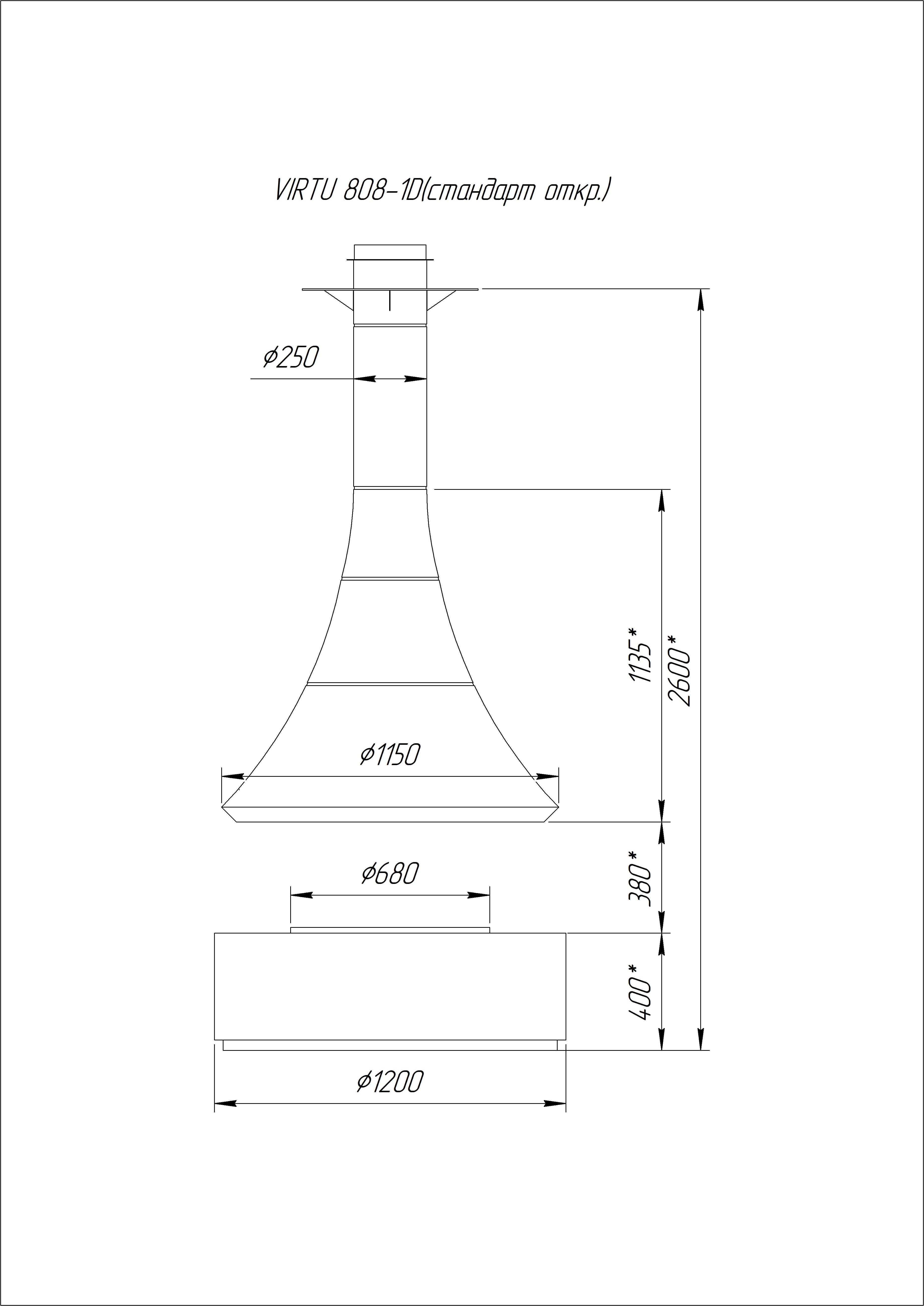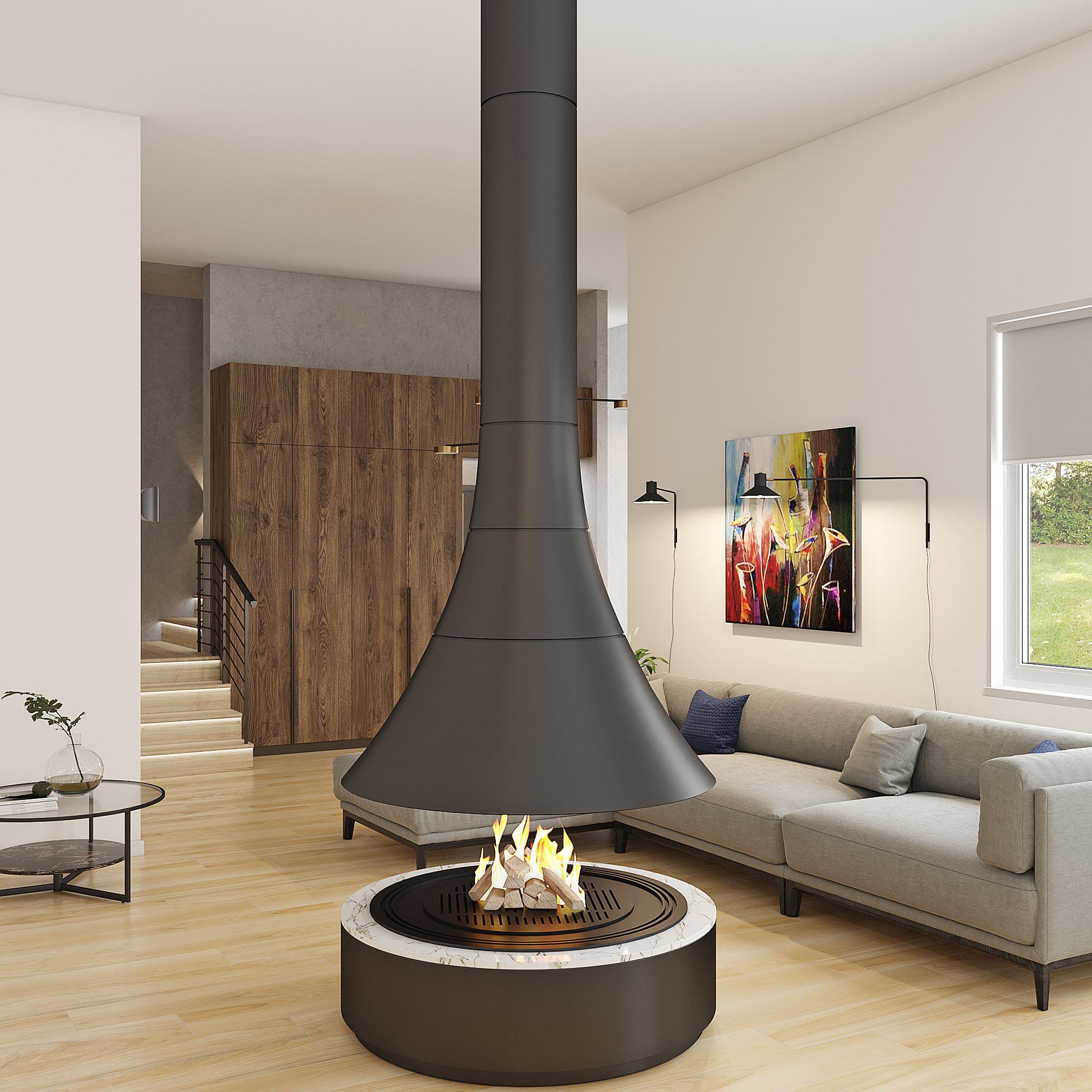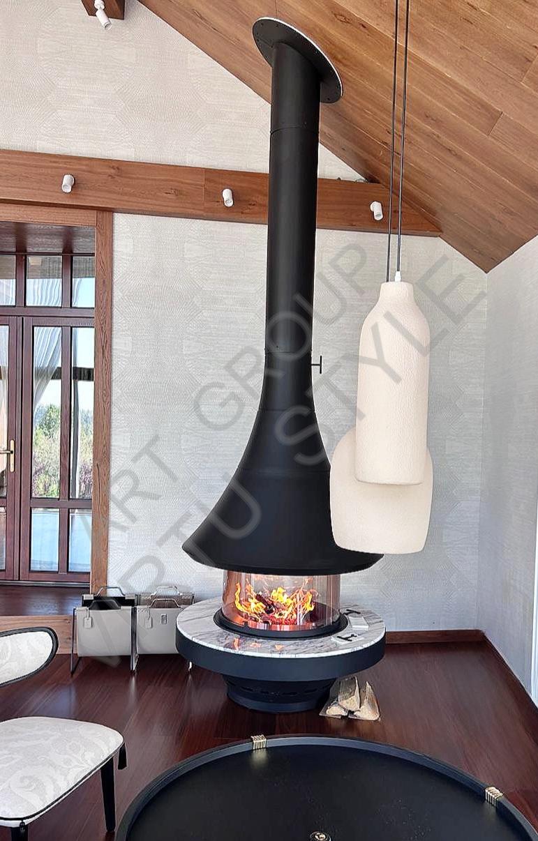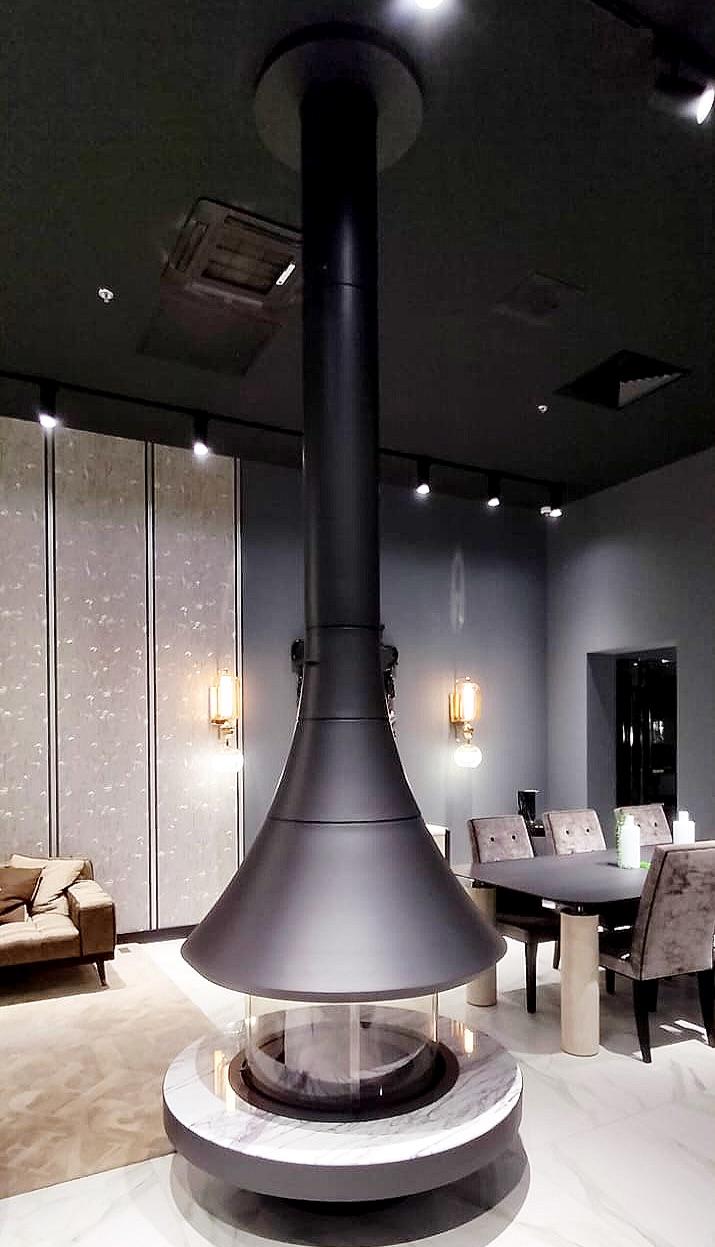 Камин подвесной, центральный от производителя Фабрика VIRTU. Модель похожа на Bordelet Eva 992 и Traforart Lorena. Особенность дизайна камина - радиусной конус диаметром в основании 1150мм, состоящий из секций. Высокое качество поверхности конуса - ровный, гладкий радиус. В базовой комплектации камин с топкой открытого типа, секционный, камин в черном цвете, с основанием - столешницей из металла. Диаметр дымохода 270мм. Дополнительные опции - цельный конус, стеклянная топка, мраморная столешница, камин в разных цветах, газовая или био топка. Диаметр конуса камина можно менять только в сторону уменьшения.