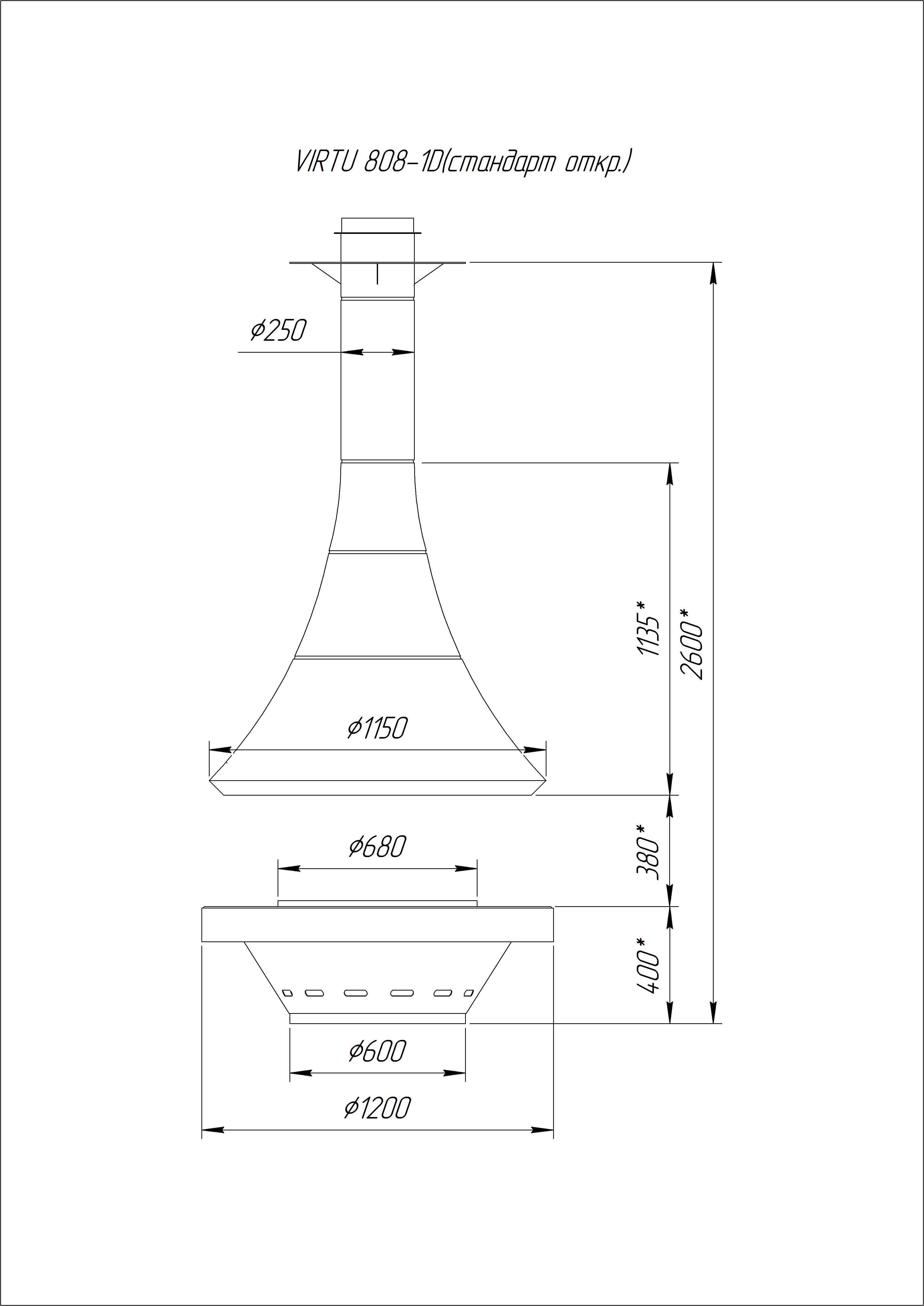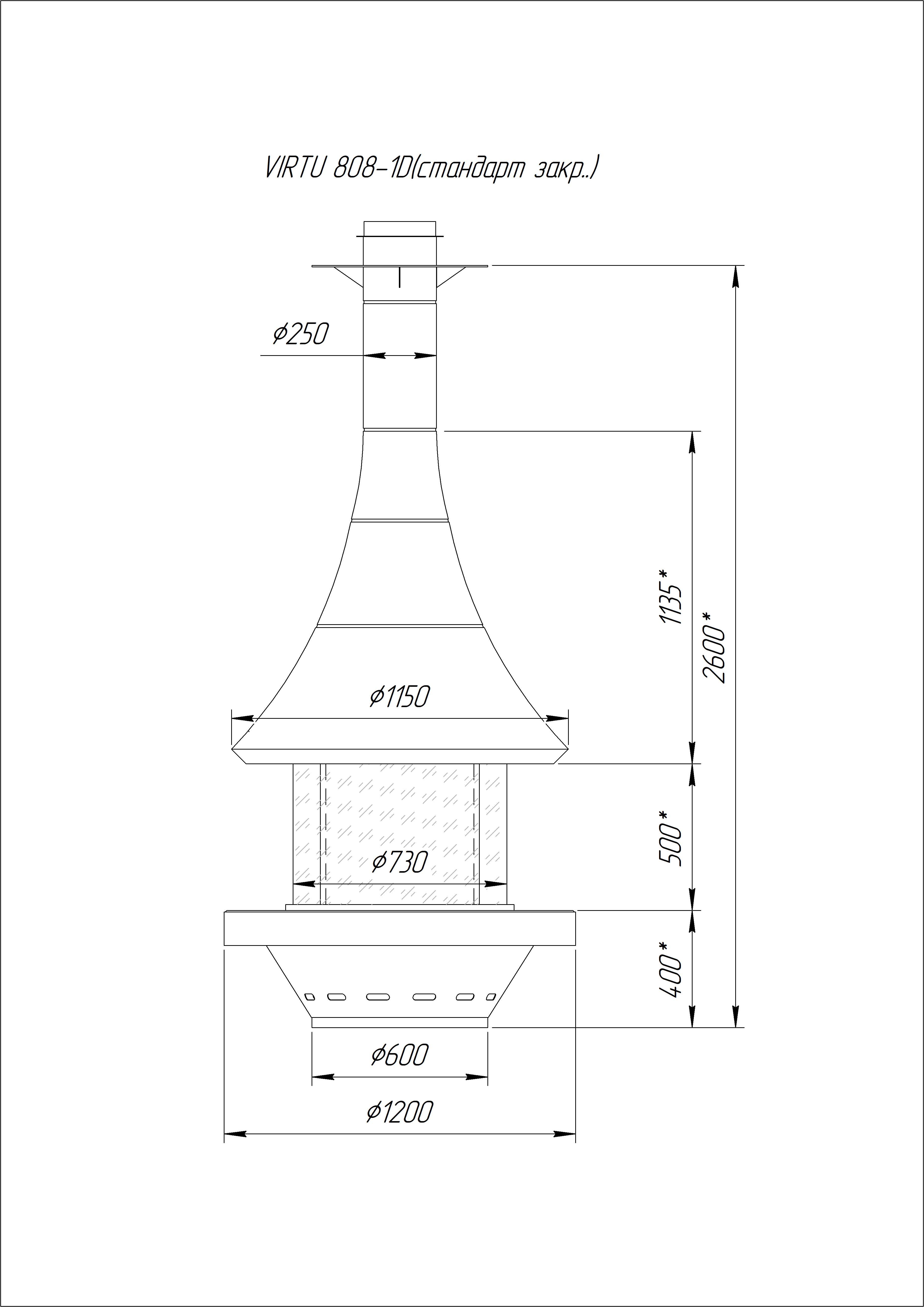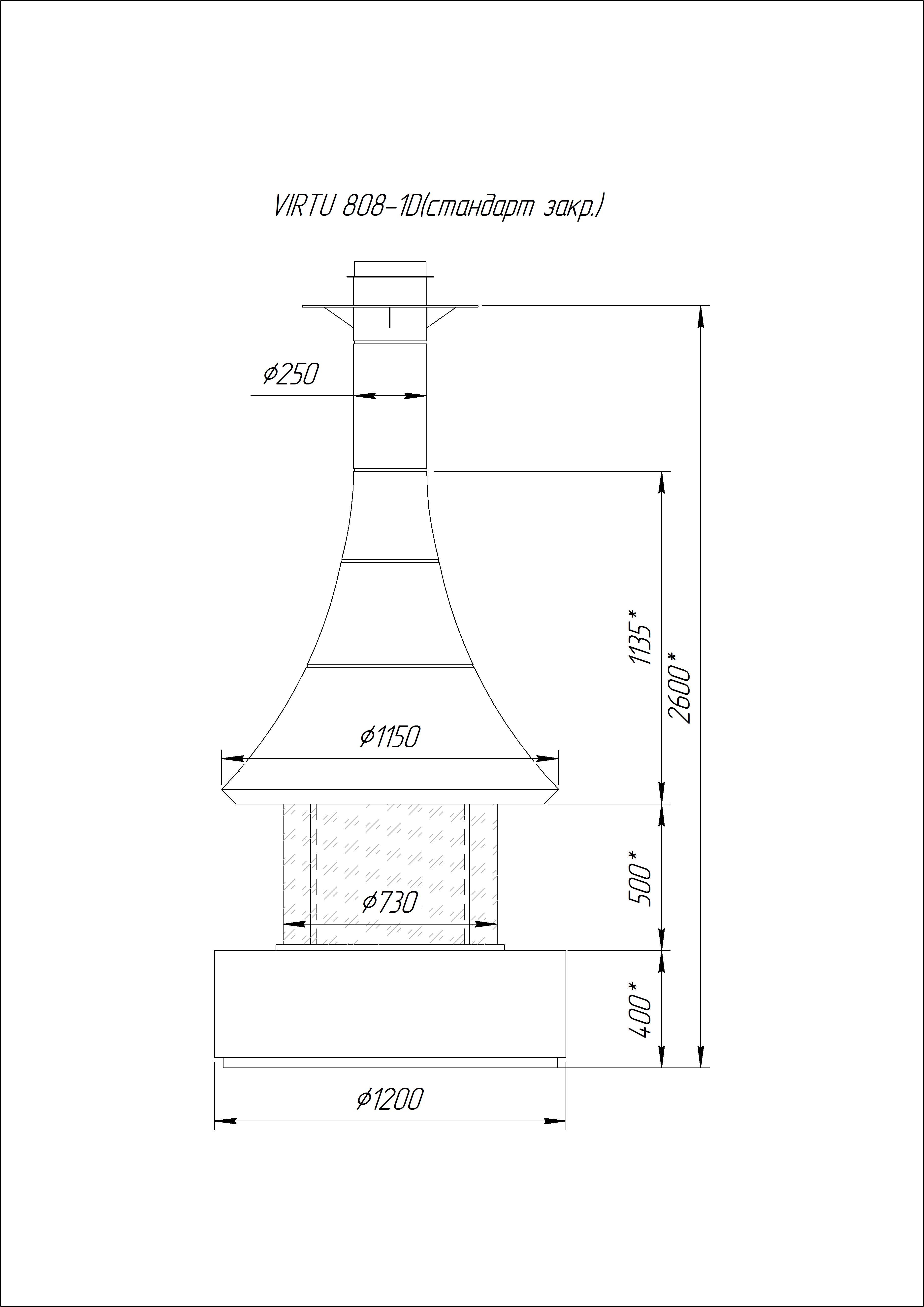 Камин подвесной, центральный от производителя Фабрика VIRTU. Модель похожа на Bordelet Eva 992 и Traforart Lorena. Особенность дизайна камина - радиусной конус диаметром в основании 1150мм, состоящий из секций. Высокое качество поверхности конуса - ровный, гладкий радиус. В базовой комплектации камин с топкой открытого типа, секционный, камин в черном цвете, с основанием - столешницей из металла. Диаметр дымохода 270мм. Дополнительные опции - цельный конус, стеклянная топка, мраморная столешница, камин в разных цветах, газовая или био топка. Диаметр конуса камина можно менять только в сторону уменьшения.