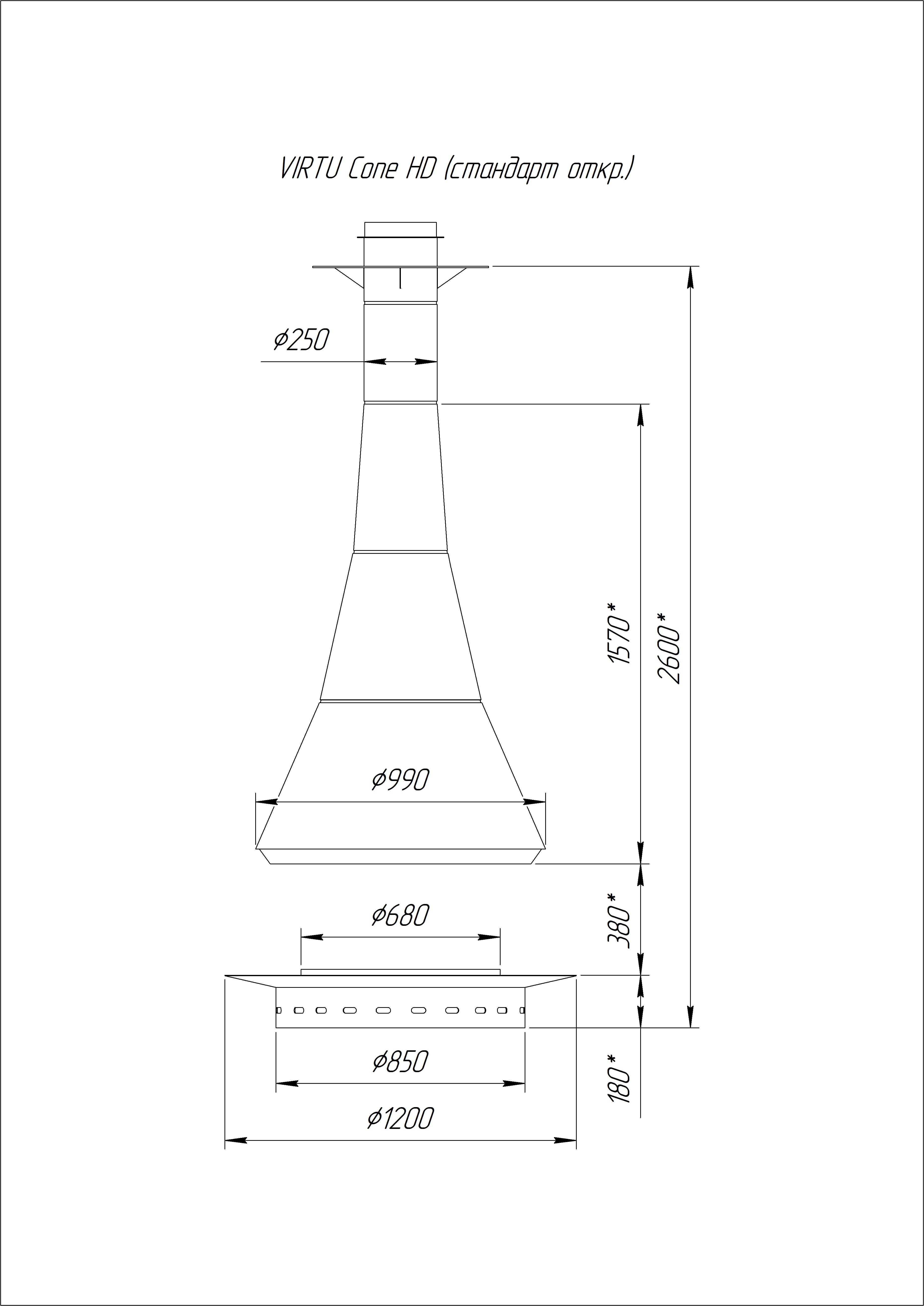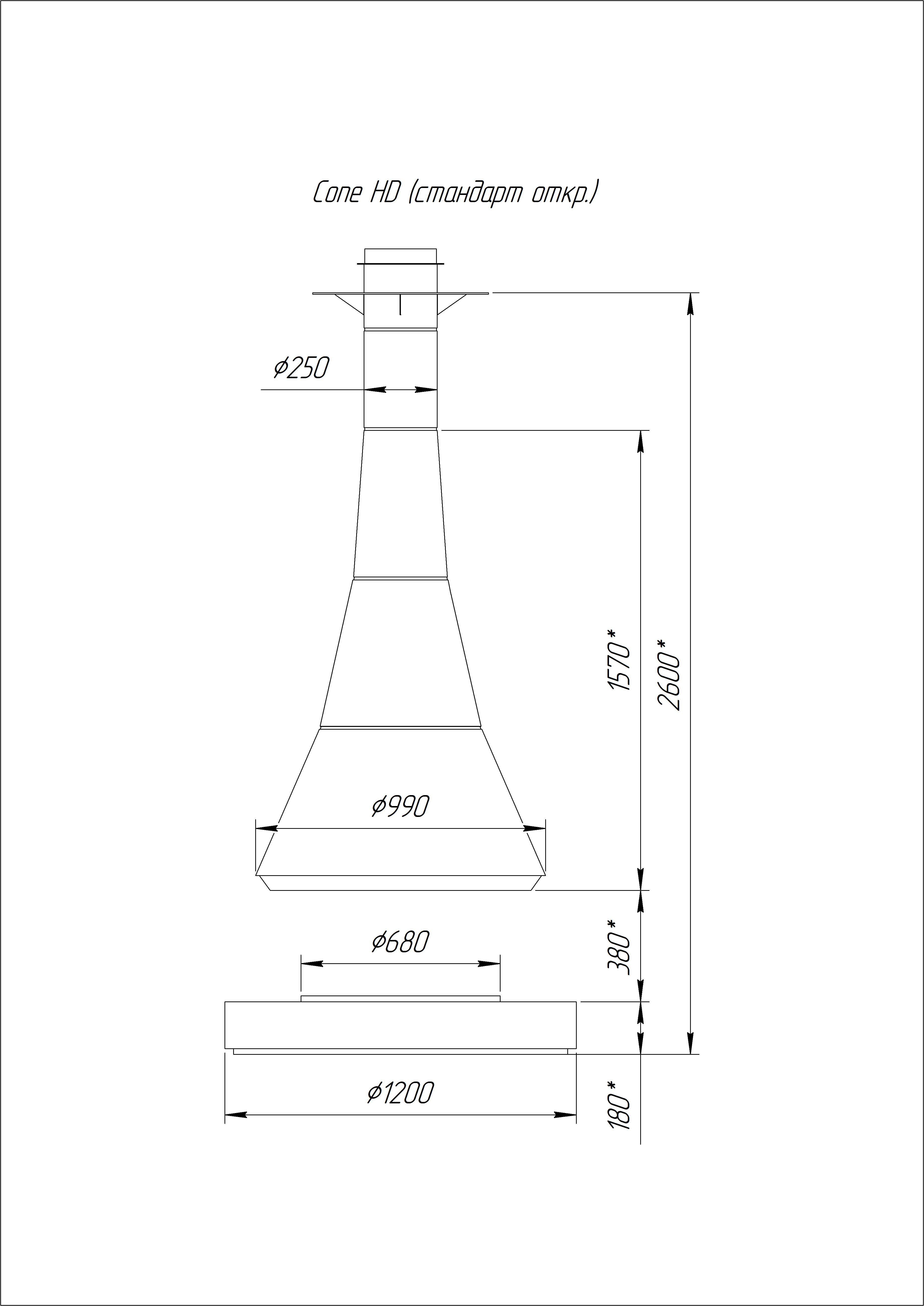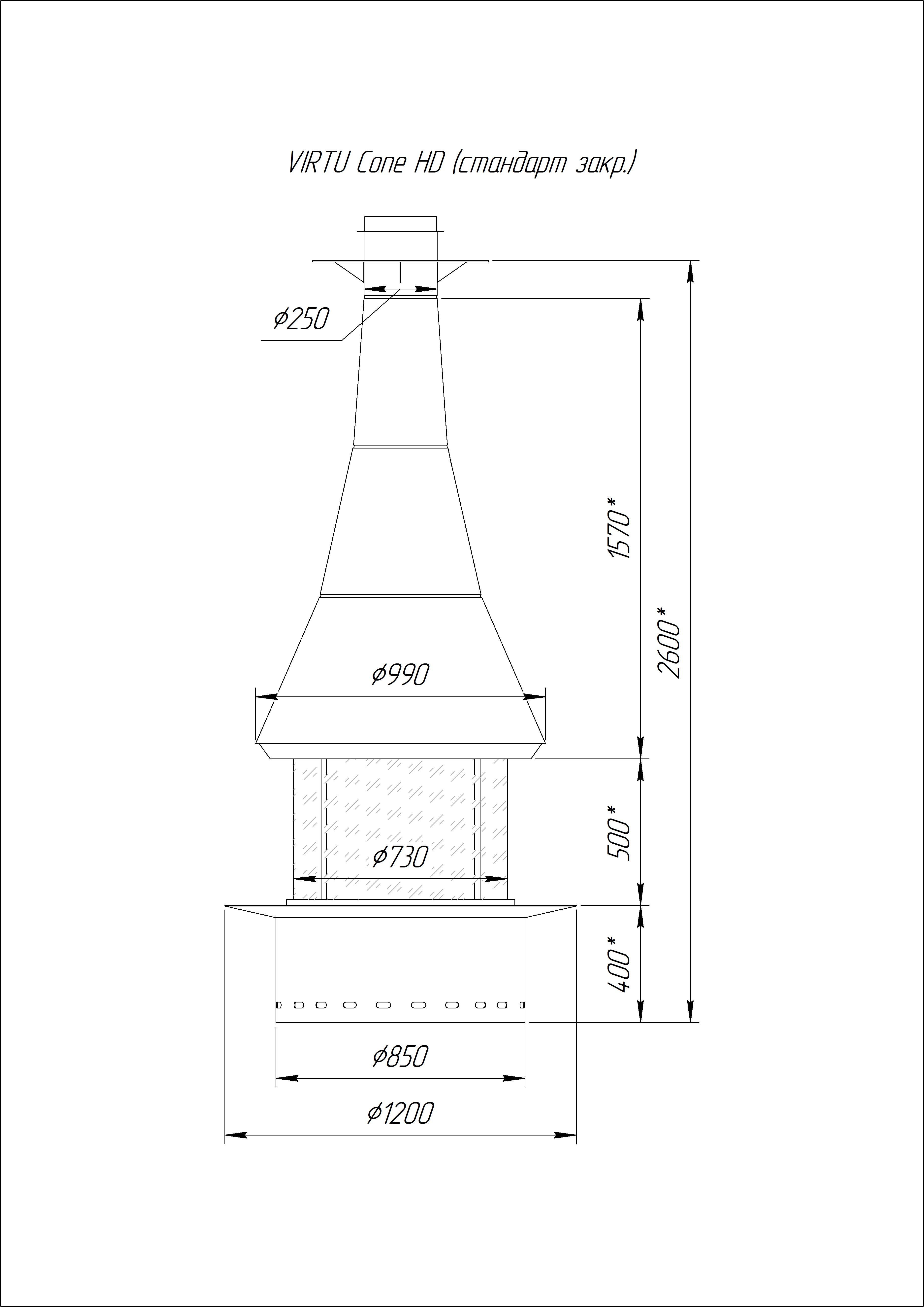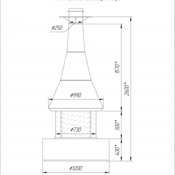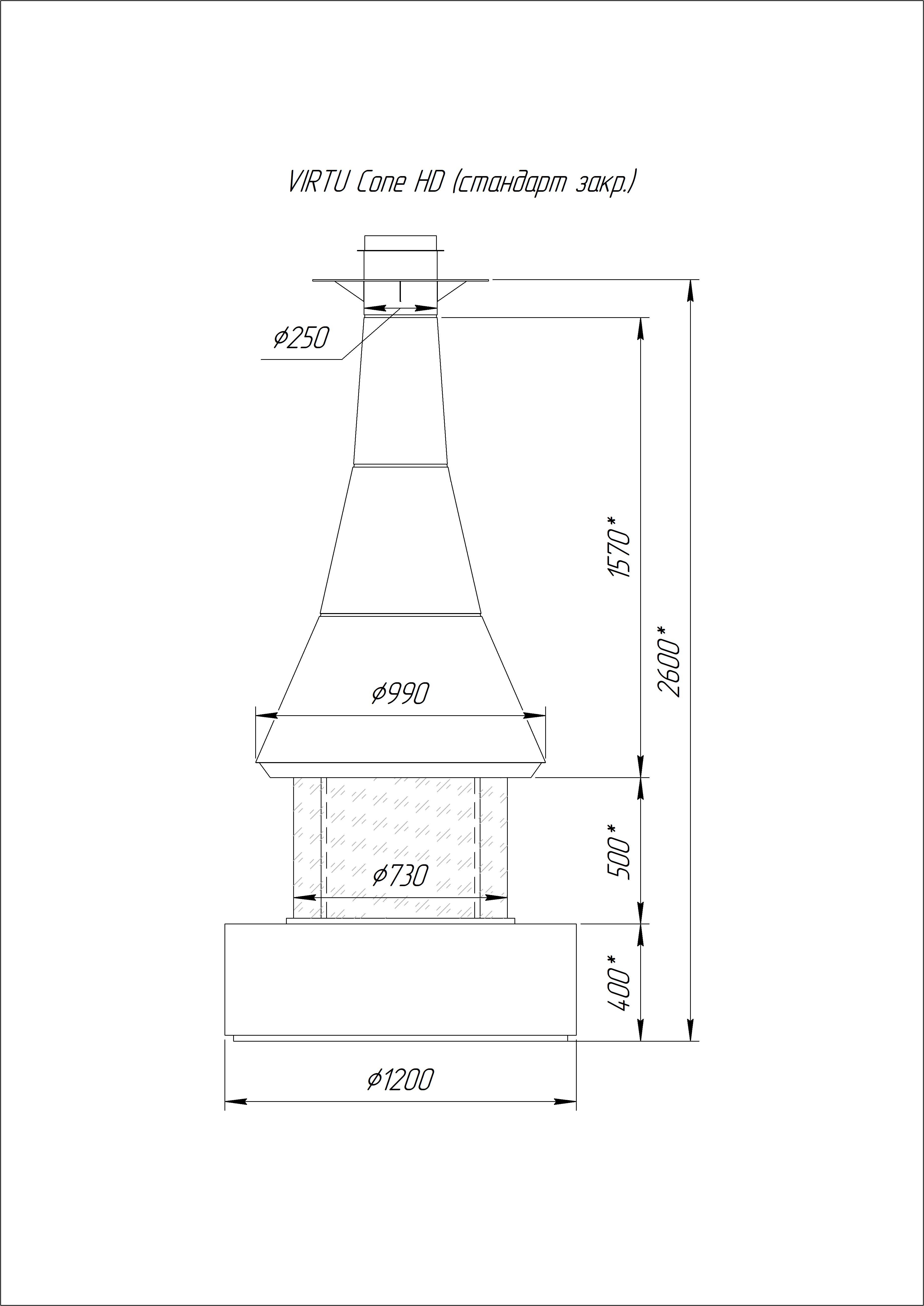 Подвесной камин, центральный с возможностью установки круглой стеклянной топки. Особенность дизайна камина - удлиненный конус, состоящий из трех конусных секций. В базовой комплектации в черном цвете, с основанием из металла. Основание камина может быть и другой формы. Размеры камины можно менять.