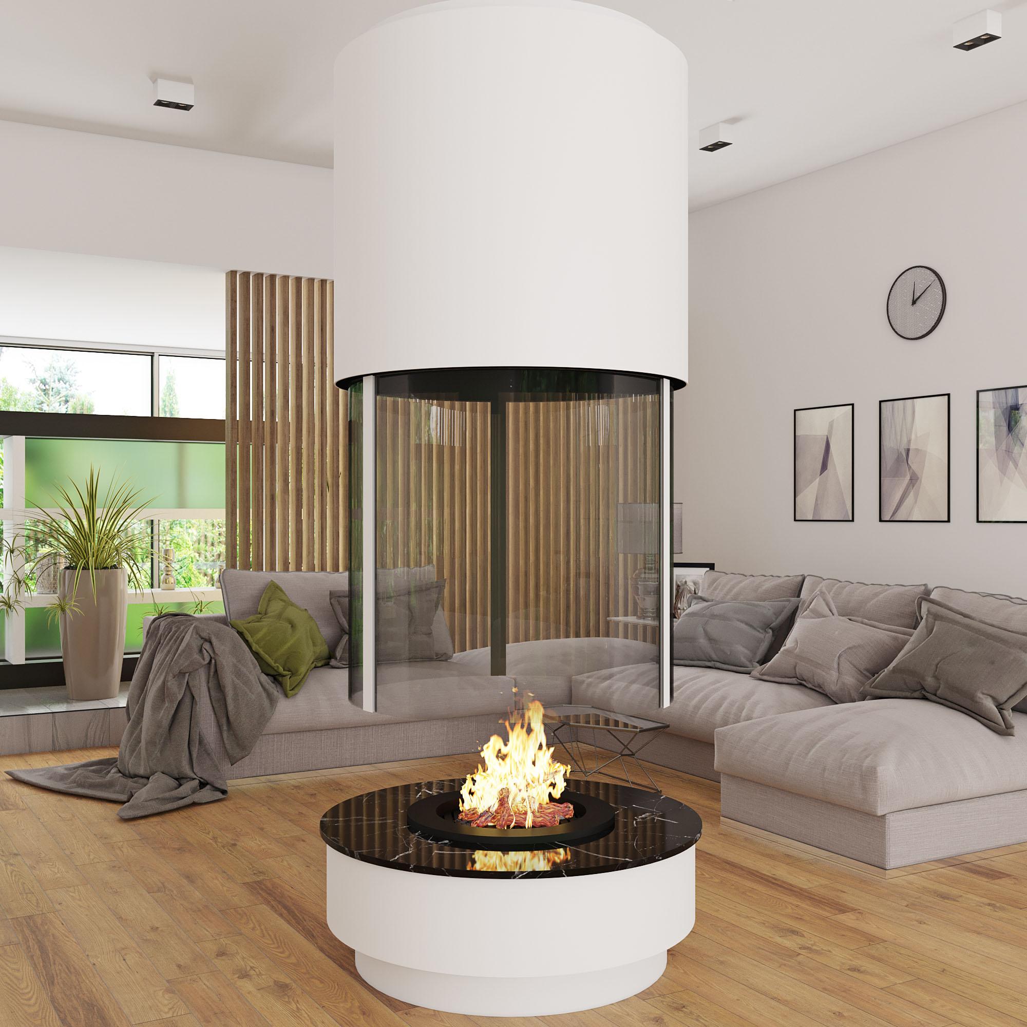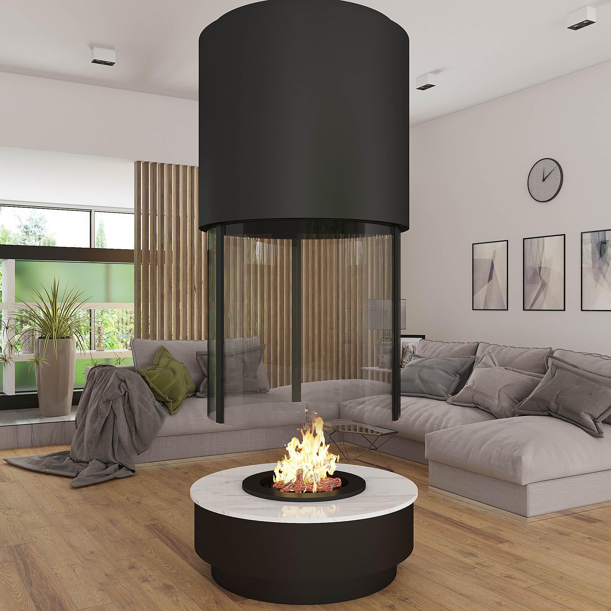 Камин Диверс - знаковая модель с максимальным углом обзора огня и идеальными пропорциями для размещения в центре зала. Круглый камин хай тек стиля. Отличительной особенностью камина являются полукруглые 3 стекла большого формата. В стандарте облицовка выполнена в черном цвете, но возможности почти неограниченны,например - отделка кожей или облицовка другого цвета. Есть несколько вариантов этой модели - с опорными столбами и без опорных столбов (подвесной).