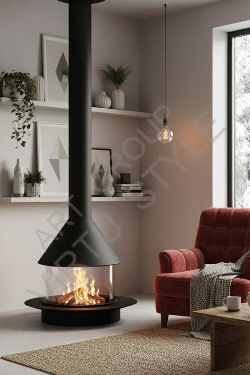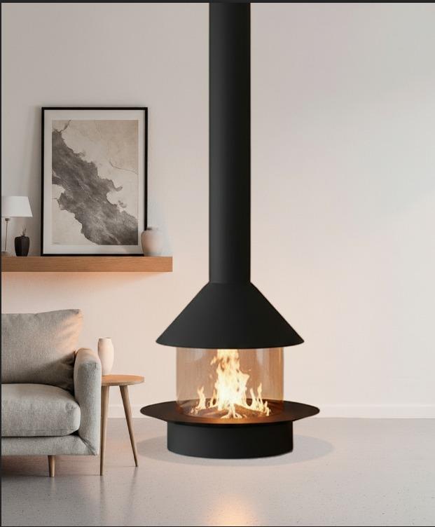 Центральный подвесной камин, с топкой подового горения, с высотой конуса 0.8м. Базовая комплектация : высота 2.6 метра. Без стеклянной топки закрытого типа