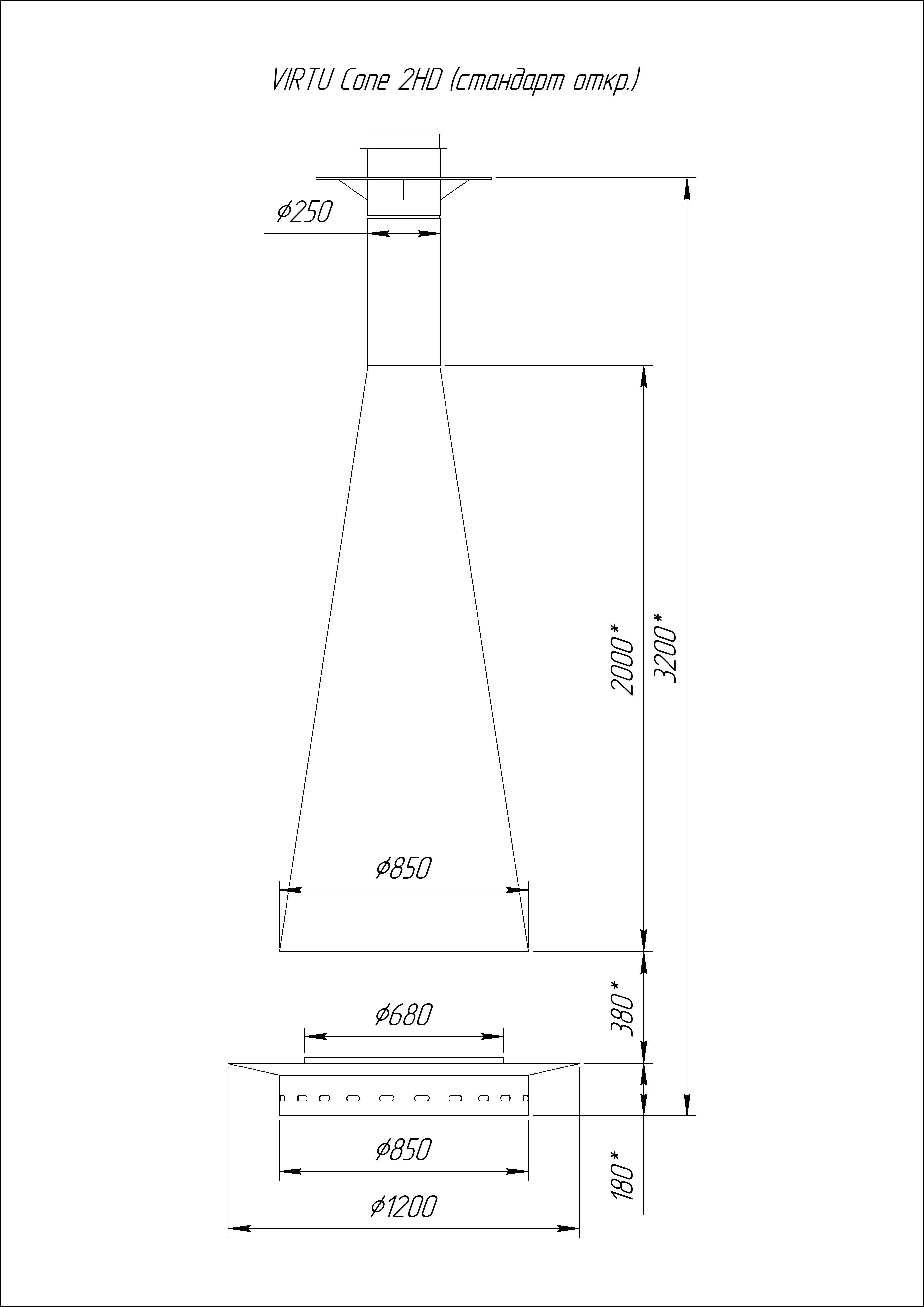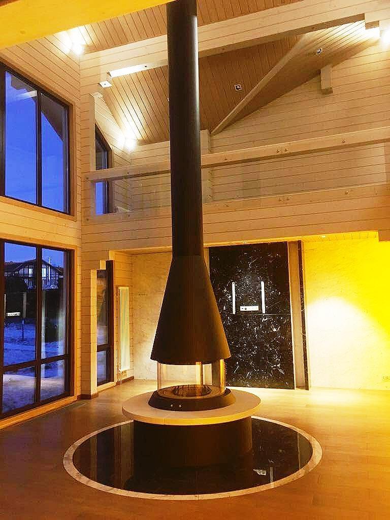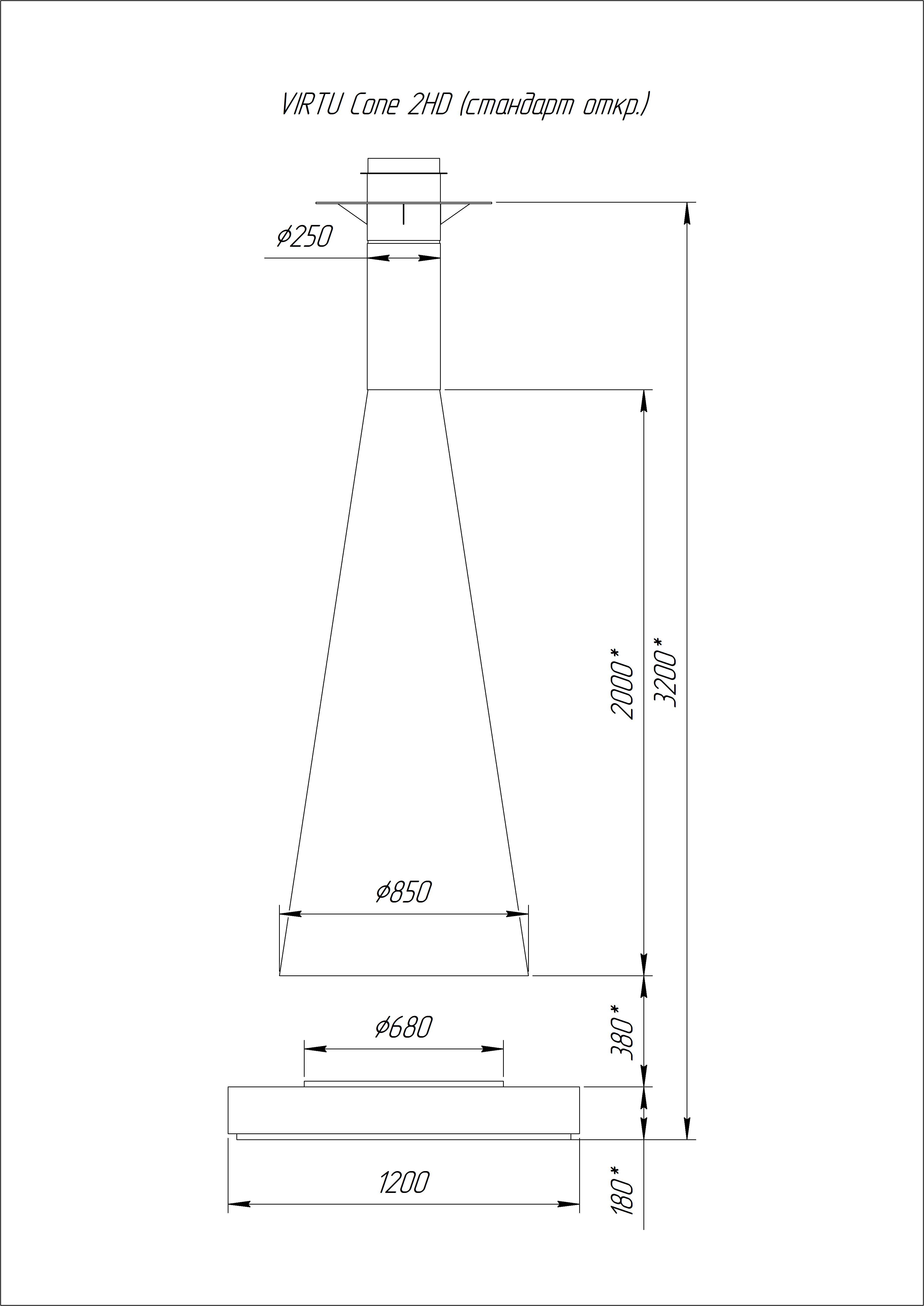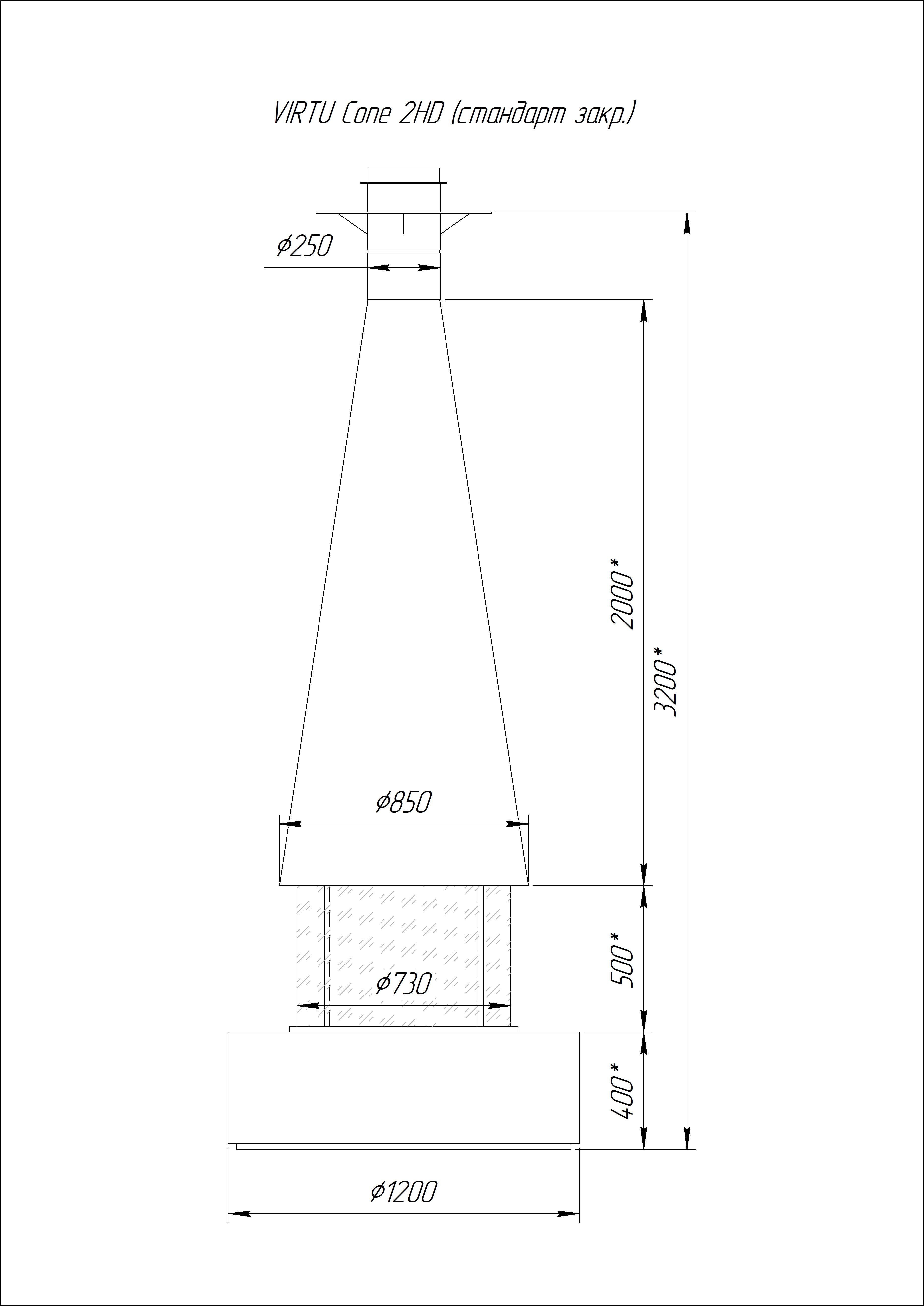 Центральный подвесной камин, с топкой подового горения. Базовая комплектация : высота 2.6 метра, размер конуса - 850 диаметр х 2000 высота х 270 малый диаметр. Без стеклянной топки закрытого типа